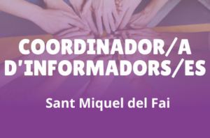 Busquem una persona amb experiència i habilitats d’atenció al públic, interessat/da en treballar a jornada parcial, els caps de setmana i festius, per fer tasques de coordinador/a d’equips d’informador/es ambientals a programes educatius, escoles, centres cívics i organitzacions per promoure una consciència ecològica activa i participativa, a Sant Miquel del Fai.