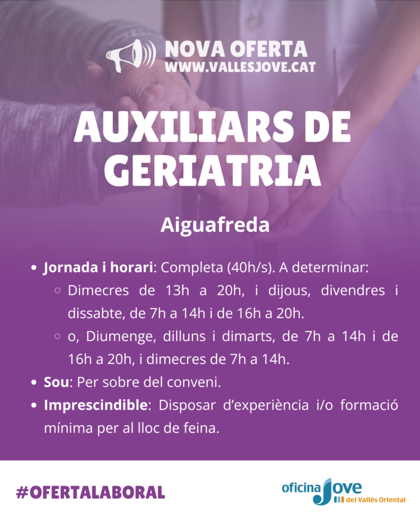 Envia el teu Currículum Vitae (CV) al correu electrònic: soa@aiguafreda.cat amb l’assumpte “Auxiliar de Geriatria – Aiguafreda“