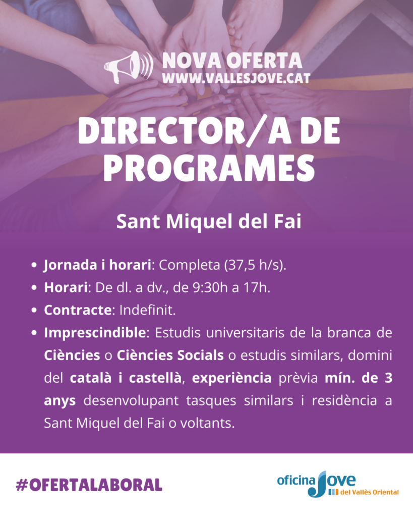 Busquem una persona amb experiència i habilitats de gestió, organització i supervisió de programes, projectes i/o equipaments, interessat/da en treballar a jornada completa amb contracte indefinit, a Sant Miquel del Fai.