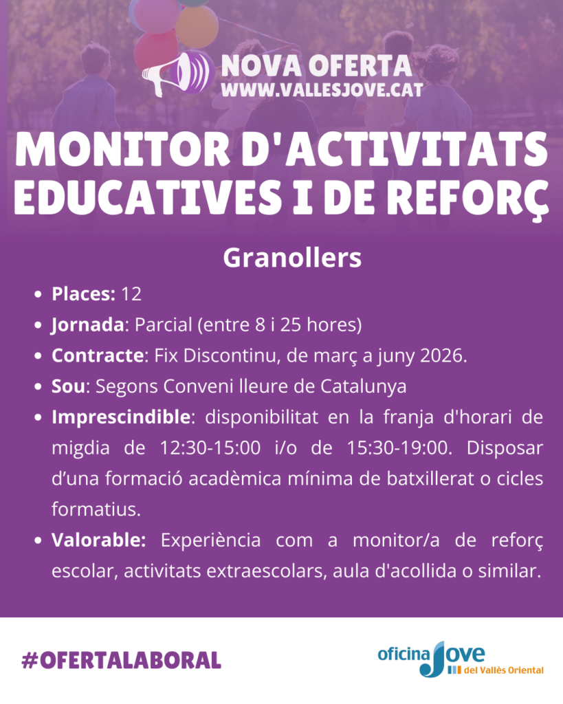Es busquen 12 monitors/es d'activitats i educatives i reforç a Granollers des d'ara fins a finals de curs.