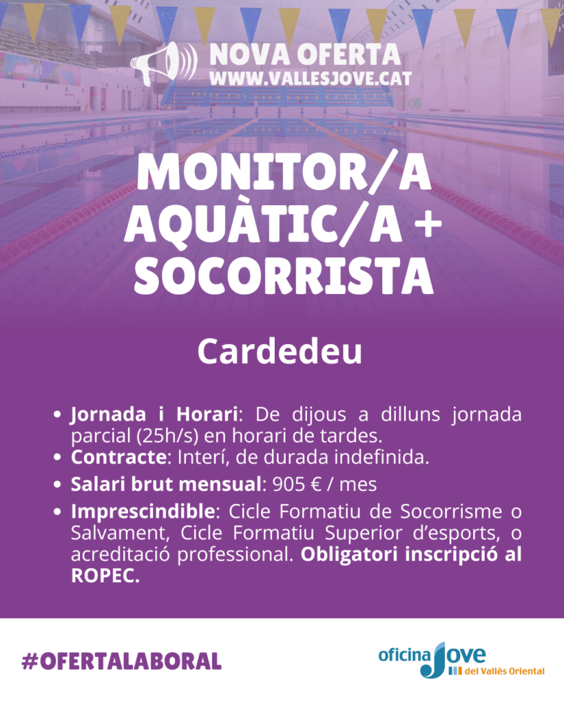 Envia el teu Currículum Vitae per correu a: treball3.vallesoriental@oficinajove.cat amb l’assumpte “Monitor/a aquàtic + Socorrista a Cardedeu“.