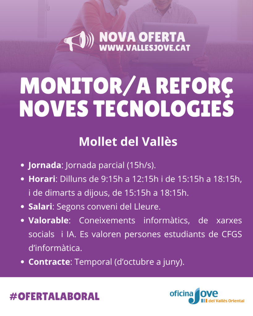 Busquem un/a monitor/a de reforç per al/la tallerista de cursos dirigits a persones majors de 55 anys, amb coneixements informàtics i de noves tecnologies, per treballar a jornada parcial de 15h/s, a Mollet del Vallès.