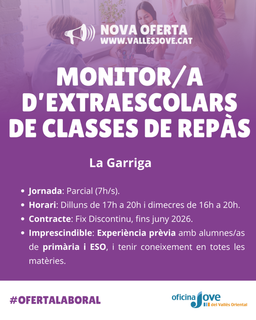 Oferta de feina (Monitor/a d’extraescolars de classes de repàs)
