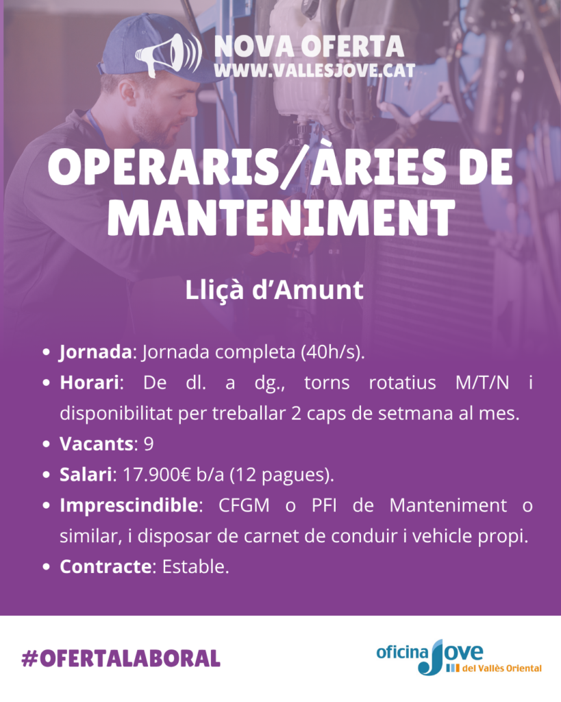 Envia el teu Currículum Vitae per correu a: treball3.vallesoriental@oficinajove.cat amb l’assumpte “Operari/ària de Manteniment – Lliçà d’Amunt“.