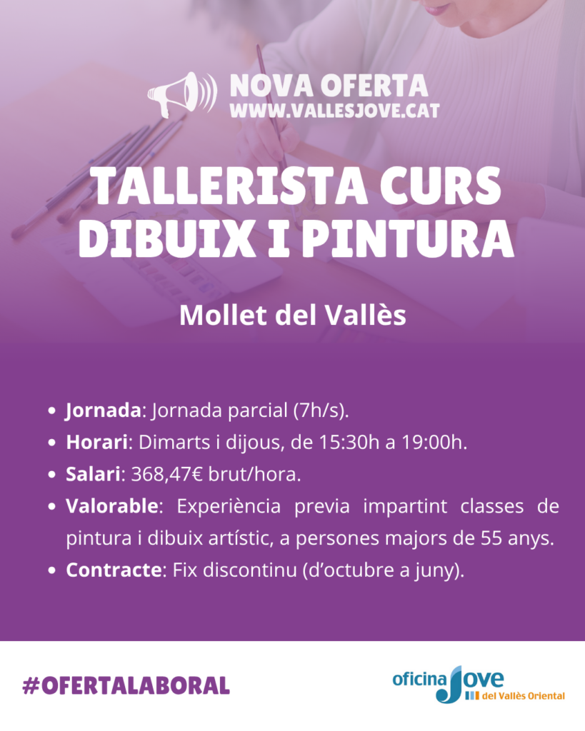 Busquem un/a tallerista actiu/va i dinàmic/a que sigui capaç de dinamitzar cursos dirigits a persones majors de 55 anys, amb coneixements de dibuix i pintura, per treballar a jornada parcial de 7h/s, a Mollet del Vallès.