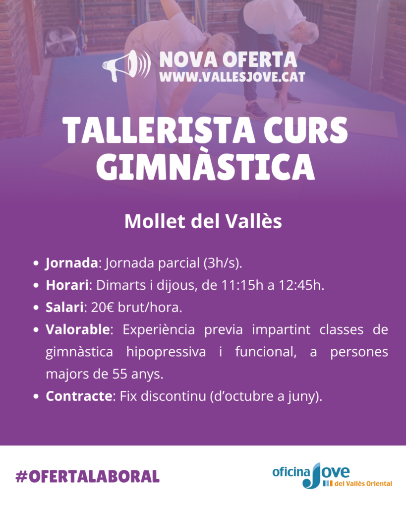 Envia el teu Currículum Vitae (CV) al correu electrònic treball3.vallesoriental@oficinajove.cat amb l’assumpte “Tallerista curs Gimnàstica – Mollet del Vallès“.