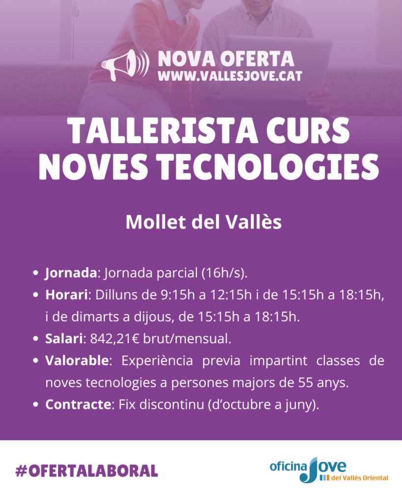 Envia el teu Currículum Vitae (CV) al correu electrònic treball3.vallesoriental@oficinajove.cat amb l’assumpte “Tallerista curs Noves Tecnologies – Mollet del Vallès“.